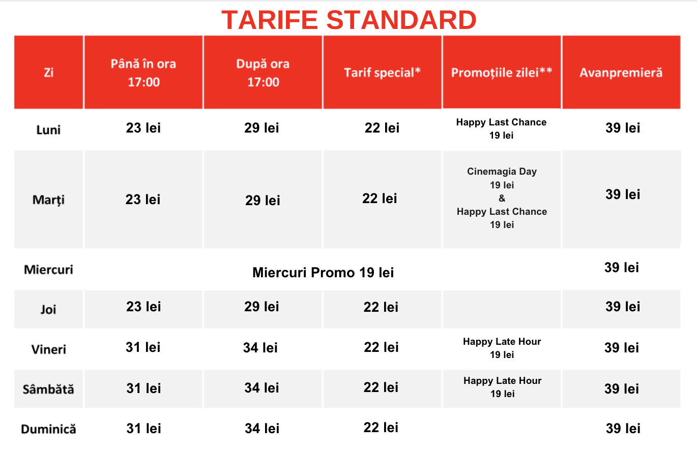 **Tarif special: valabil pentru copii sub 10 ani, elevi, studenți, pensionari, de luni până duminică, indiferent de oră, cu excepția avanpremierelor.